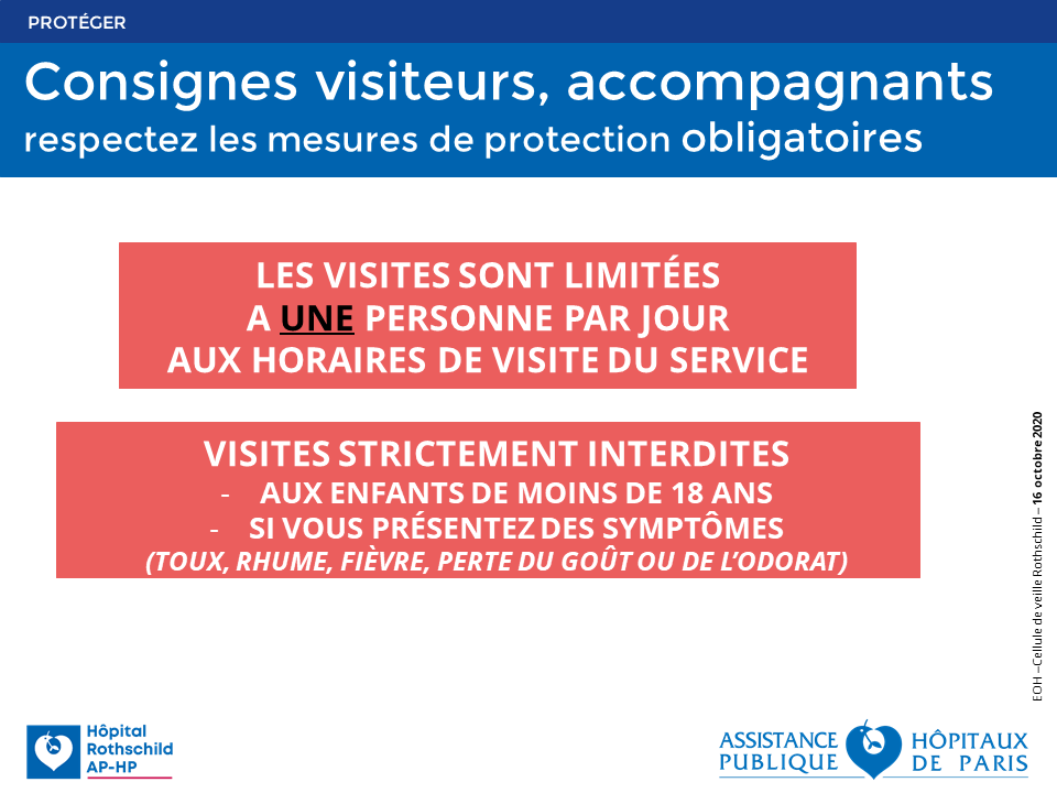 Dans le contexte épidémique actuel, l’accès aux hôpitaux est strictement encadré, hors cas d’urgence. La présentation d’un « pass sanitaire » est obligatoire et est demandée à l’entrée de l’établissement à l’ensemble des visiteurs.